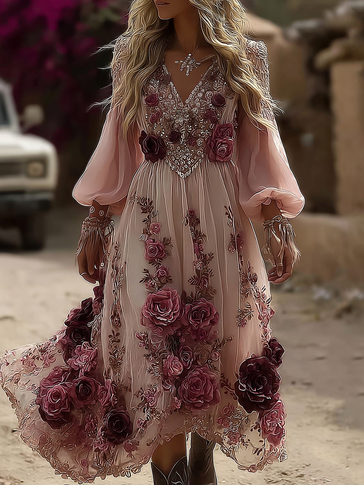 Women’s Classic Romantic Pink Rose Embroidery Art Comfy Linen V Neck Maxi Dress