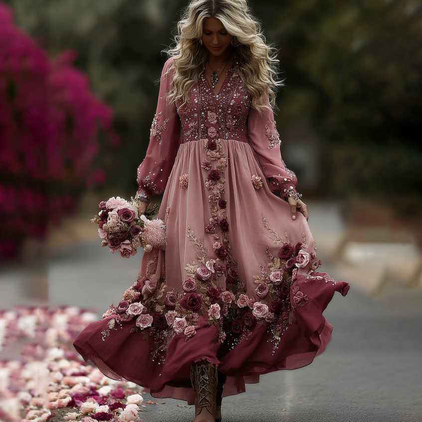 Women’s Classic Romantic Pink Rose Embroidery Art Comfy Linen V Neck Maxi Dress