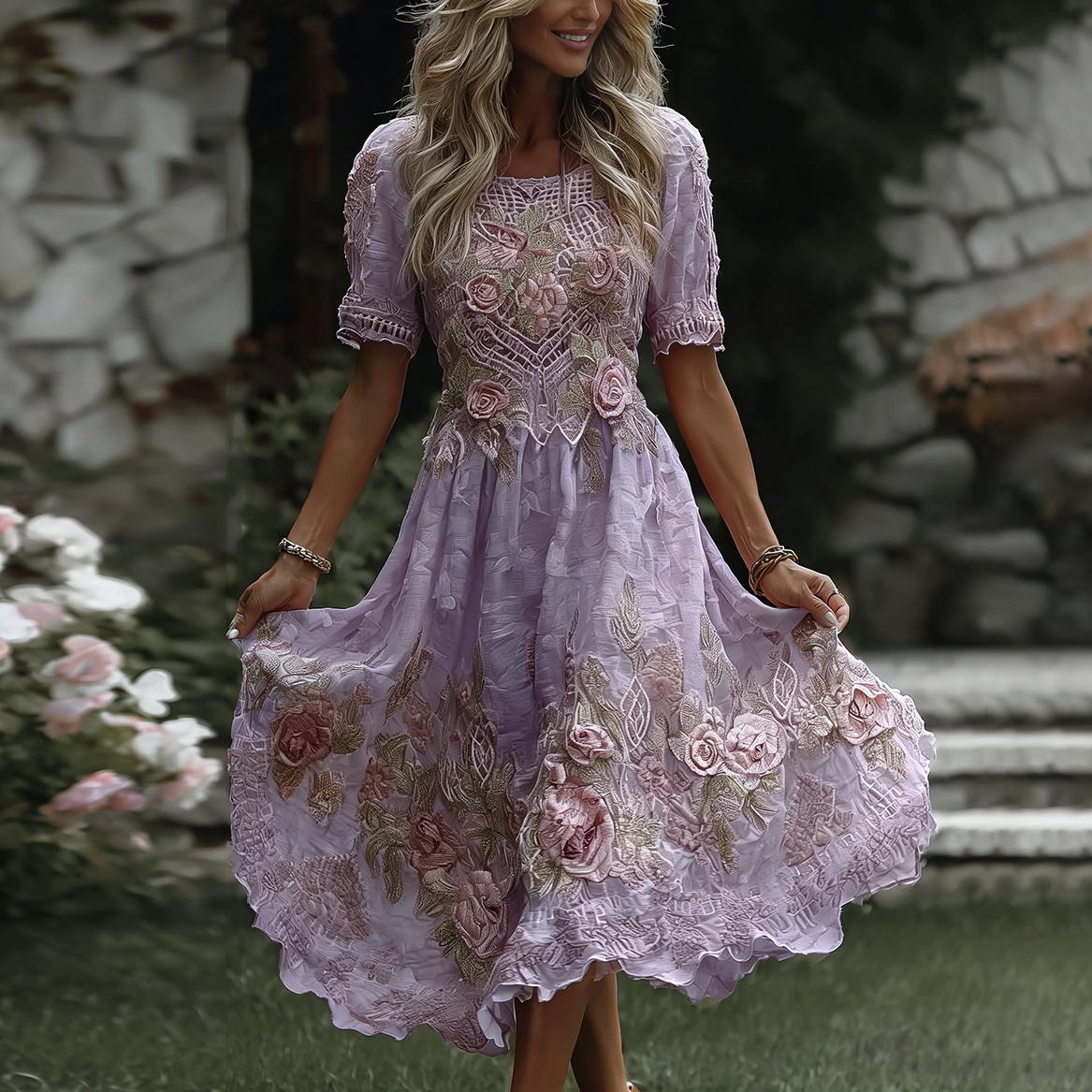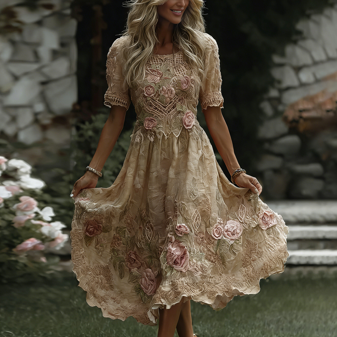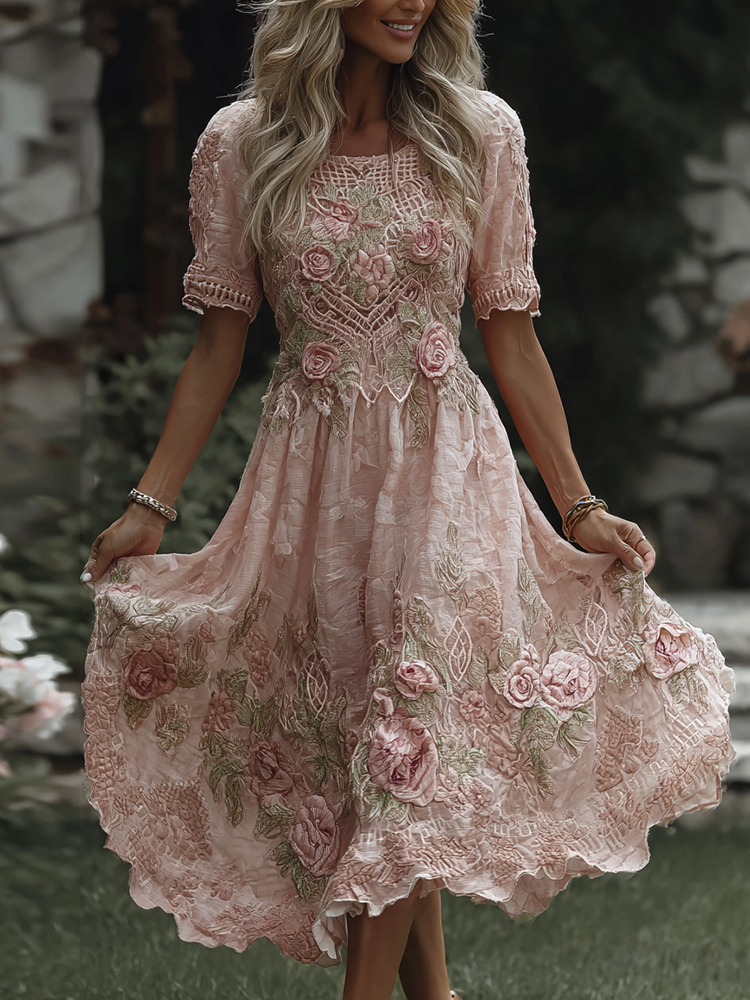 Women’s Vintage Pink Rose Embroidery Art Round Neck Short Sleeve Linen Blend T-shirt