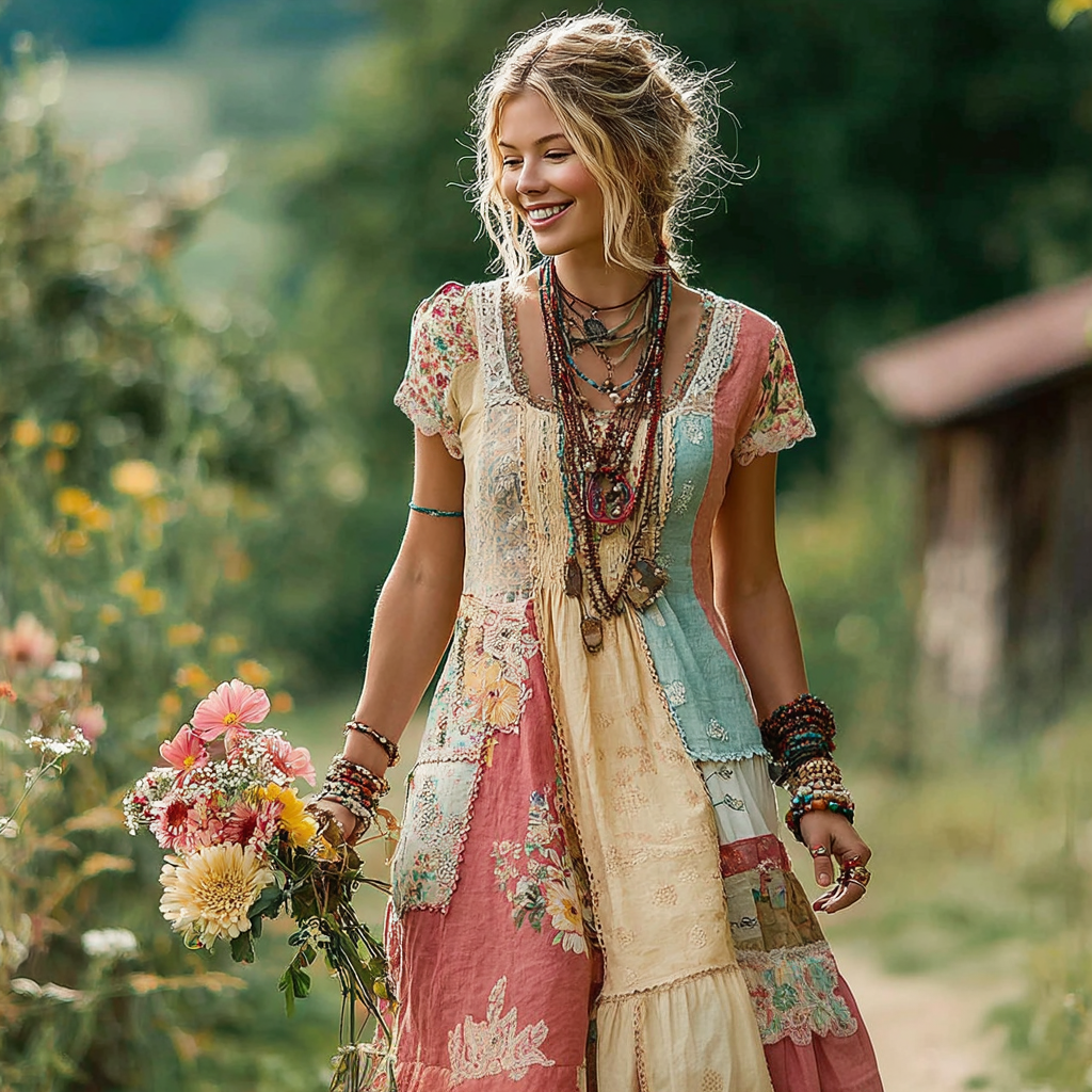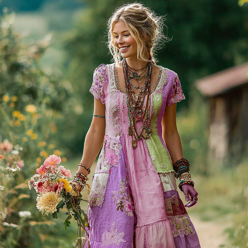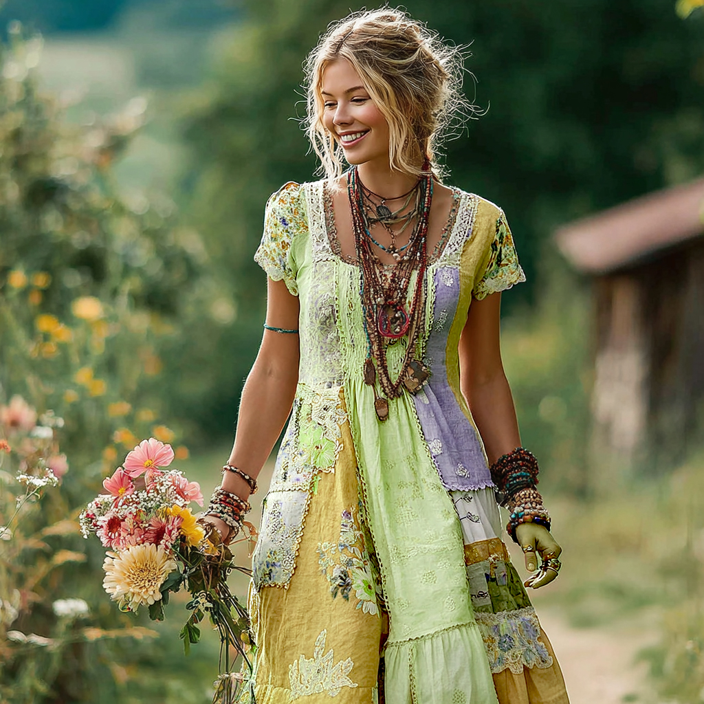 Women’s Floral Color Block Round Neck Short Sleeve Long Dress