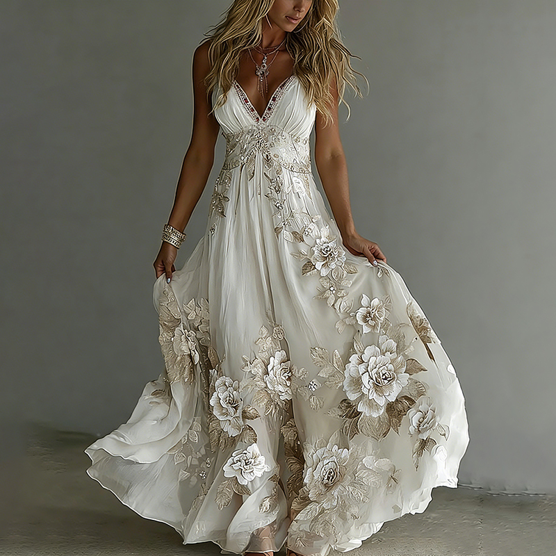 Women’s Floral Embroidery Art Suspender Maxi Dress