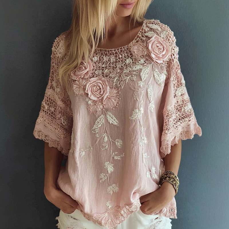 Women’s Floral Embroidery Lace Linen Crew Neck T-shirt