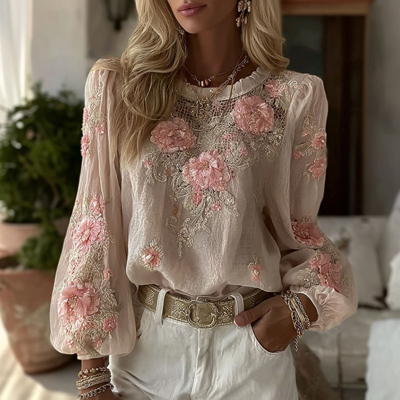 Women’s Floral Embroidery Long-sleeved Linen Blend Crew Neck T-shirt