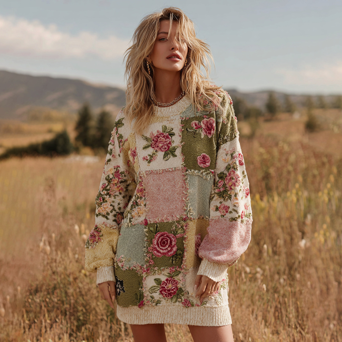 Women’s Floral Patchwork Art Cozy Knit Mini Sweater Dress