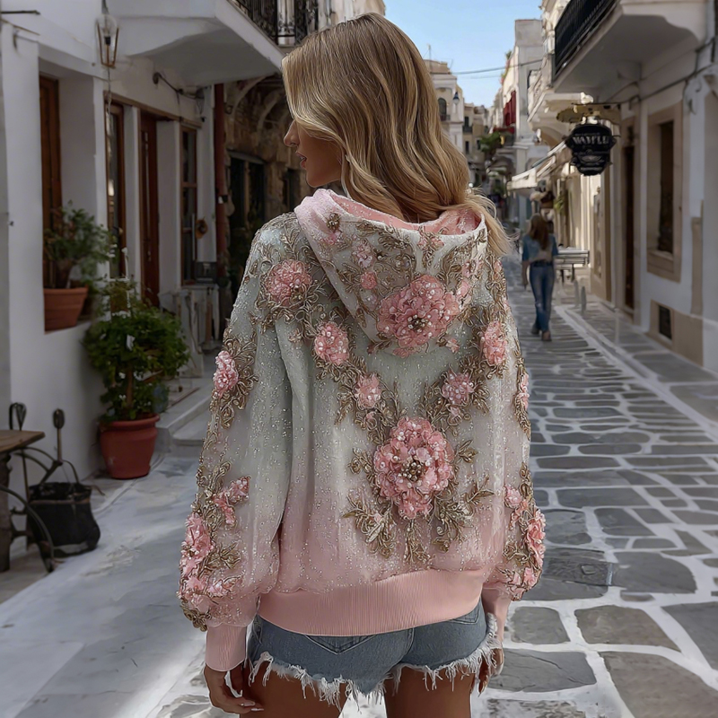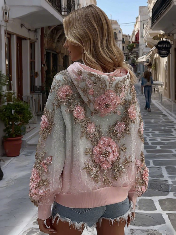 Women’s Pink Rose Embroidery Art Round Neck Long Sleeve Linen Blend T-shirt