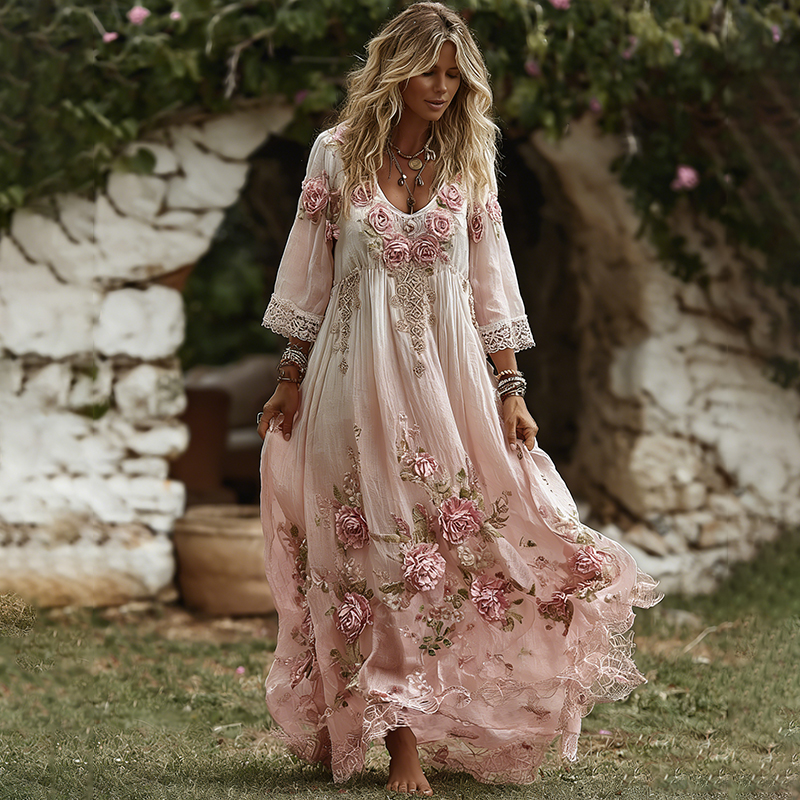 Vintage Boho Roses Embroidered Flowy Linen Maxi Dress
