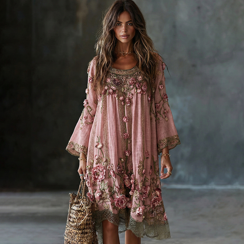 Vintage Boho Roses Embroidered Flowy Linen Maxi Dress
