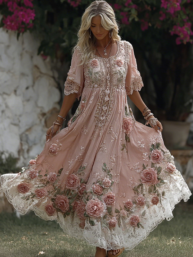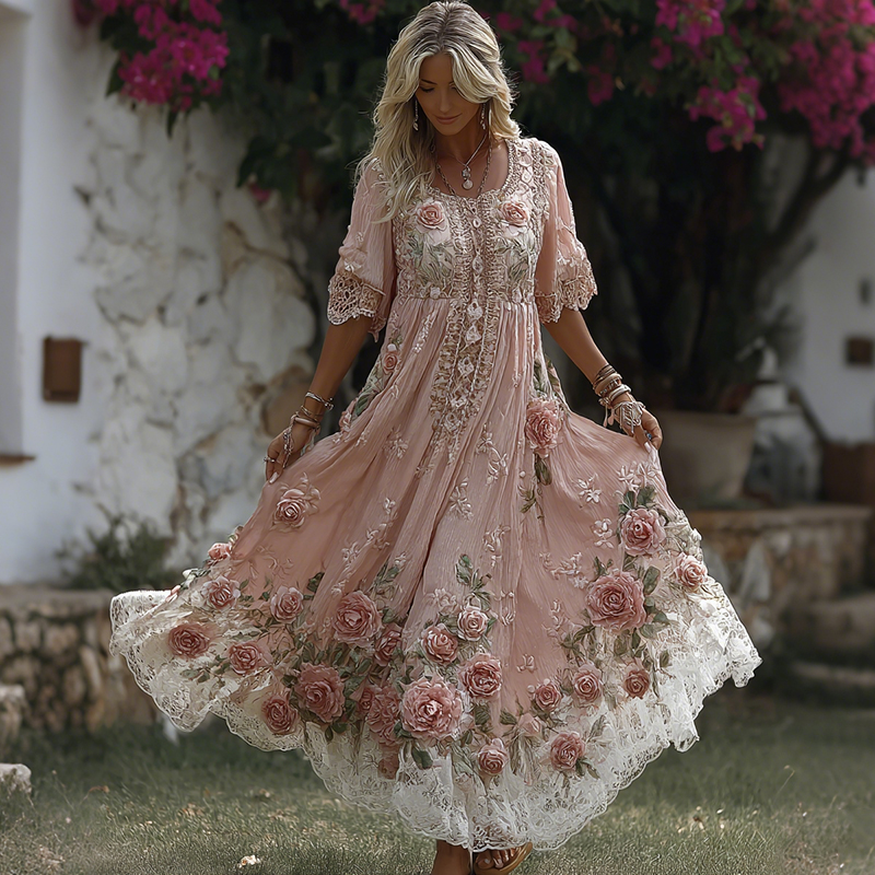 Women’s Vintage Rose Embroidery Art Comfy Linen Maxi Dress