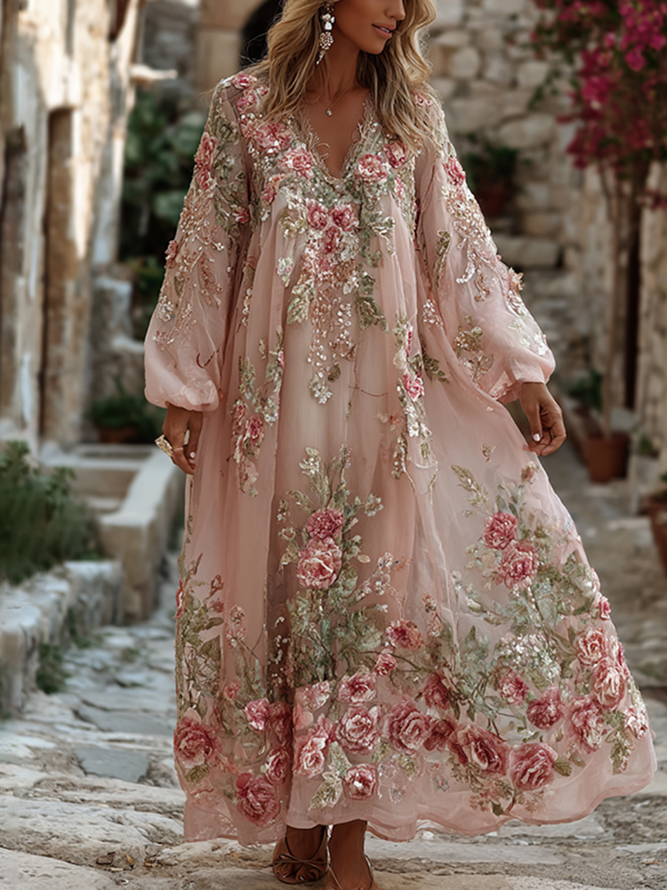Women’s Pink Floral Embroidered Art V-neck Loose Midi Dress