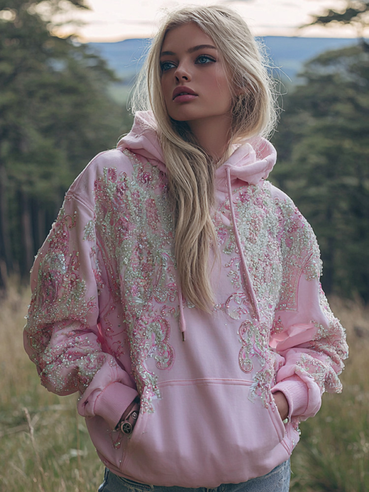 Women’s Pink Flower Embroidery Art Long Sleeve Hoodie