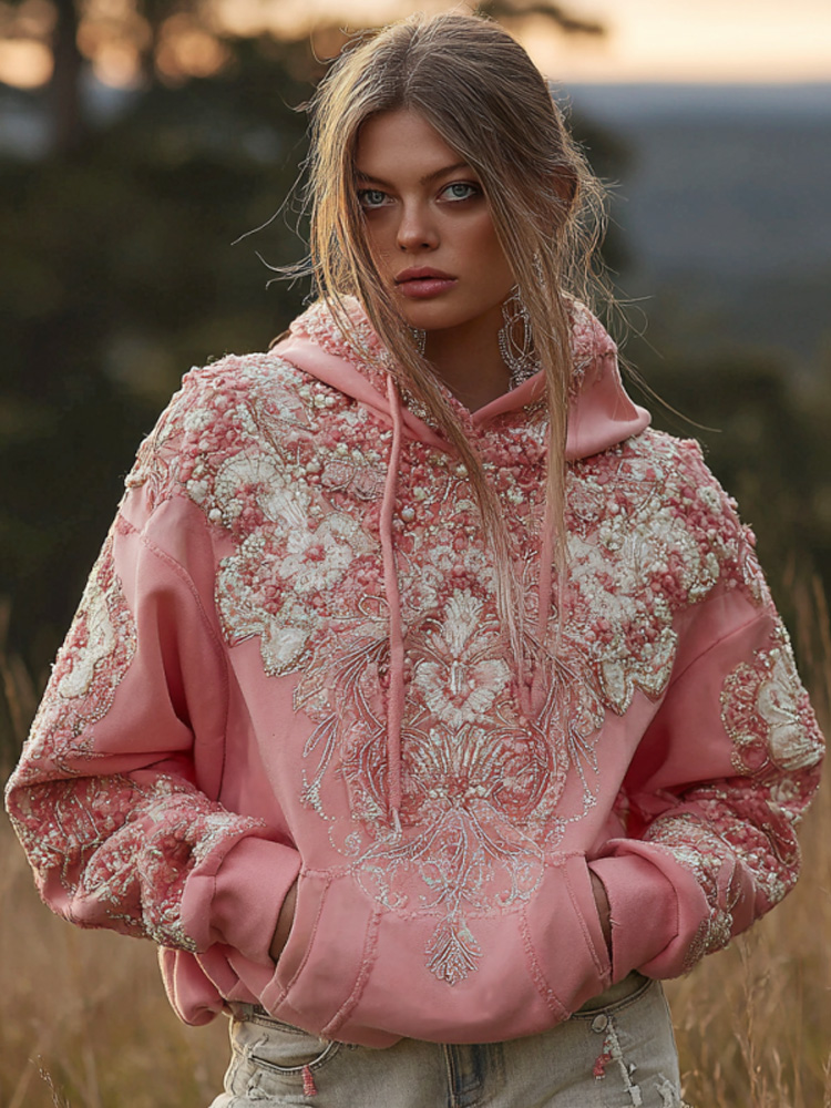 Women’s Pink Flower Embroidery Art Long Sleeve Hoodie