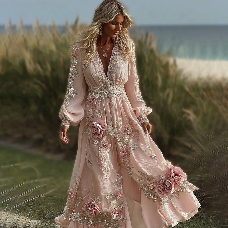 Women’s Pink Rose Embroidered Art V-neck Long Sleeve Midi Dress