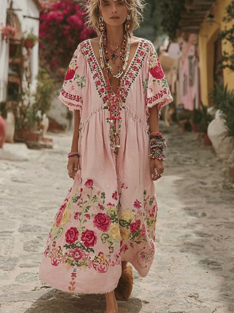 Women’s Pink Rose Embroidery V-neck Short Sleeve Loose Linen Blend Midi Dress