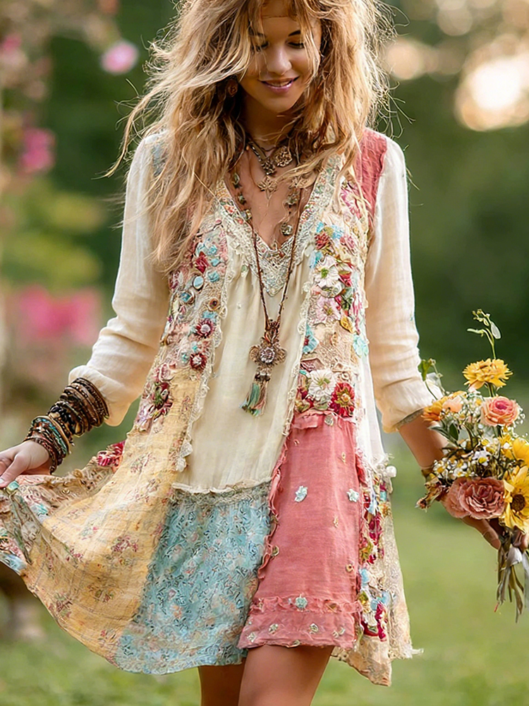 Women’s Retro Bohemian Floral Casual V-neck Long Sleeve Dress