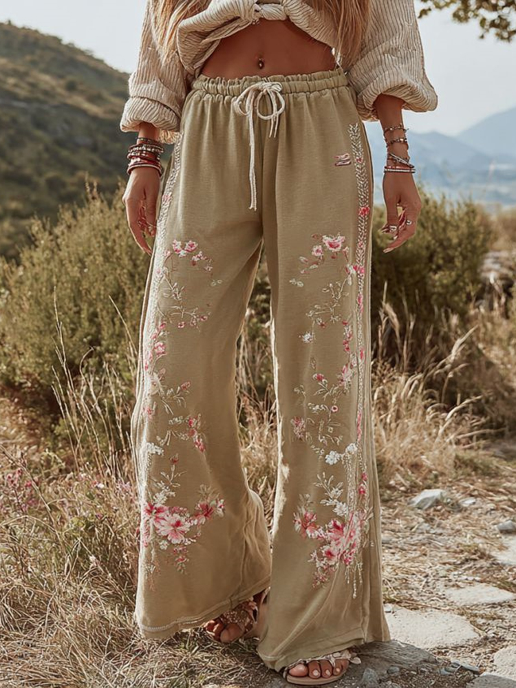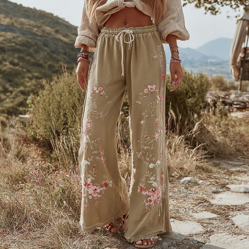 Women’s Retro Bohemian Rose Art Linen Pants