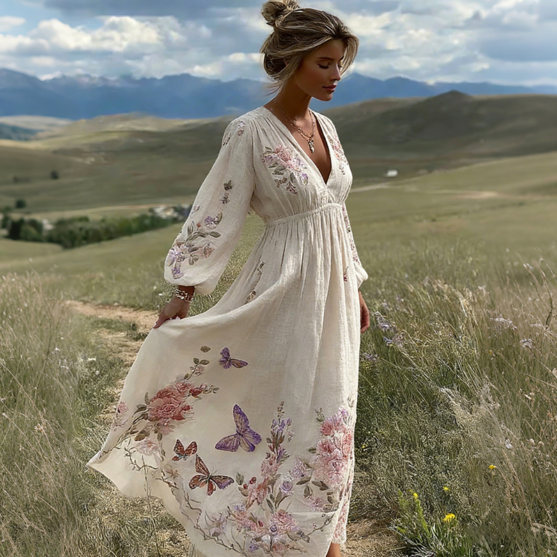 Women’s Retro Bohemian Style Floral And Butterfly Comfortable V-neck Dress