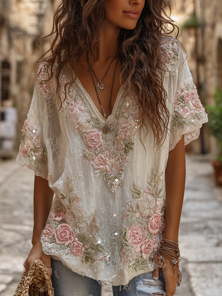 Women’s Retro Boho Pink Floral Embroidered Art V-neck T-shirt