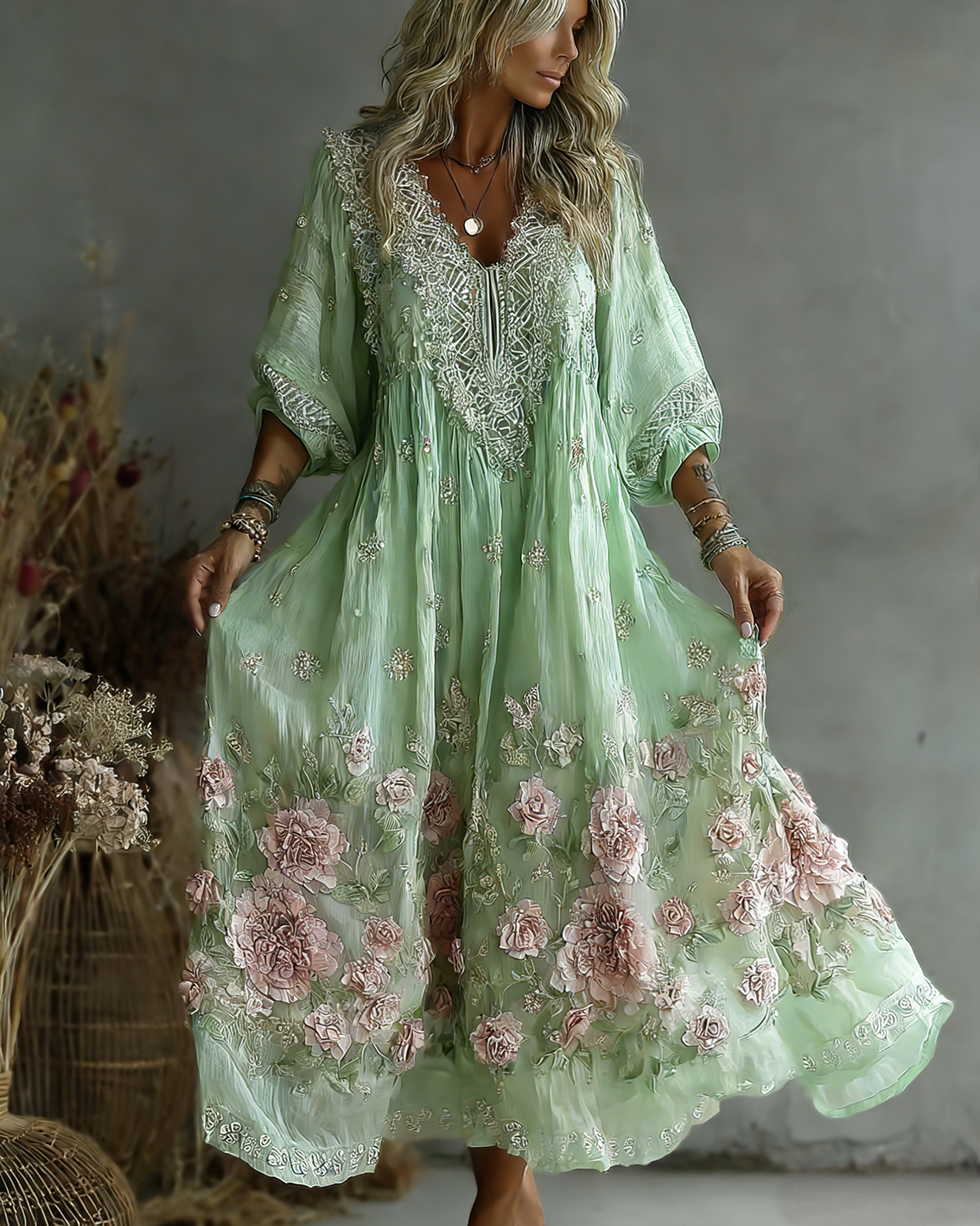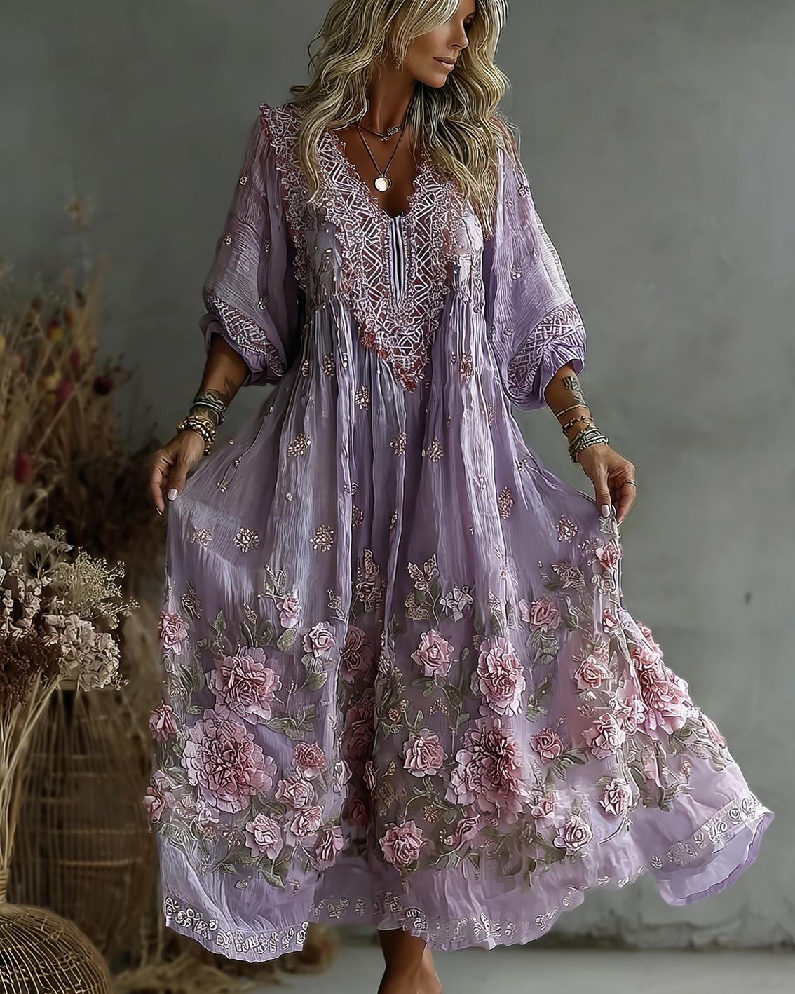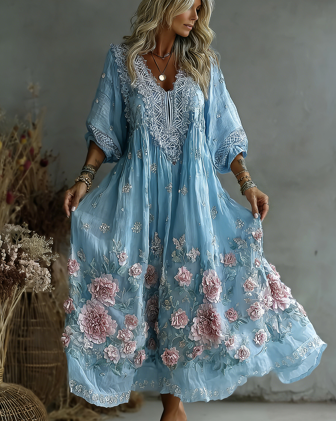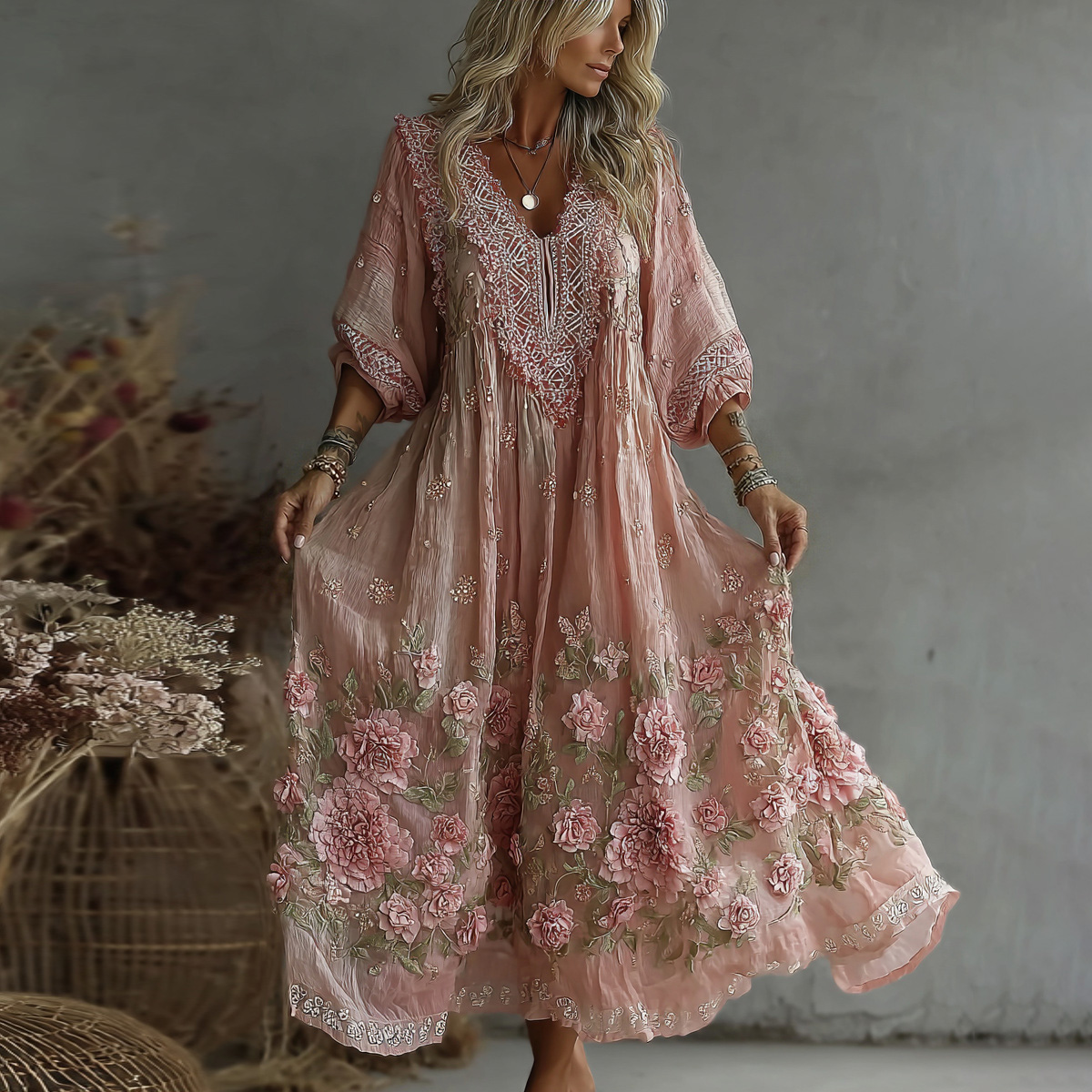 Women’s Vintage Rose Embroidery Art Comfy Linen Maxi Dress