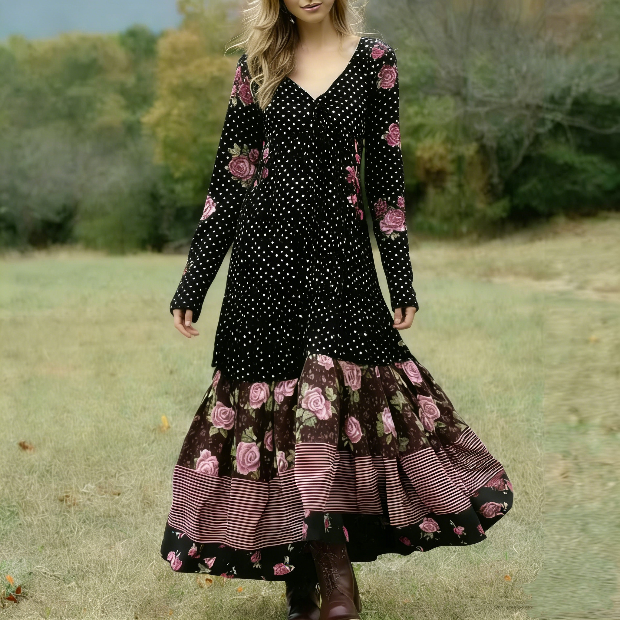 Women’s Retro Polka Dot And Rose Floral Pattern Casual Linen V-neck Dress