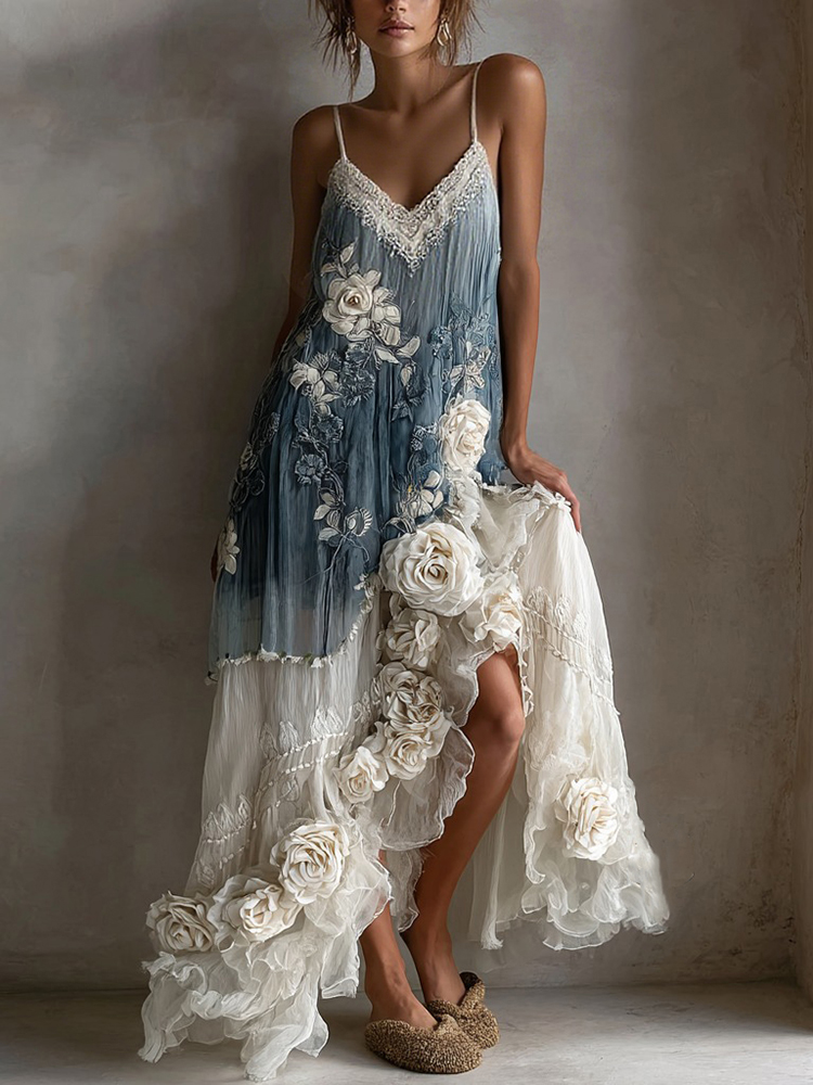 Women’s Retro White Rose Gradient Pattern Casual Sleeveless Dress