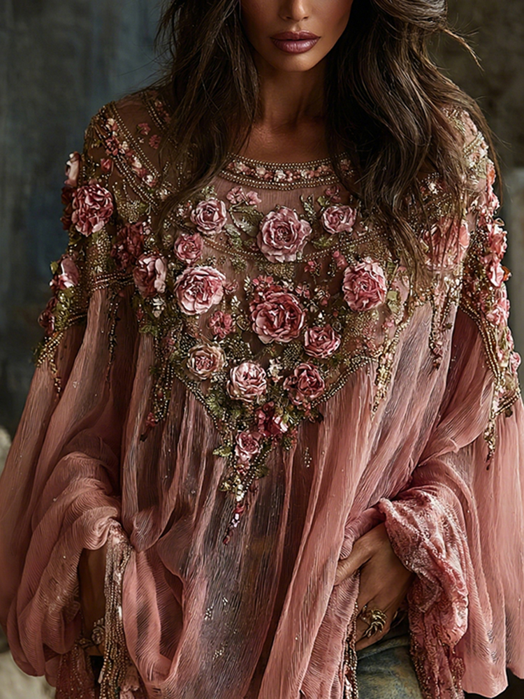 Women’s Vintage Pink Rose Embroidery Art Round Neck Long Sleeve Linen Blend T-shirt