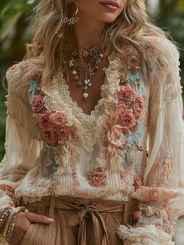 Women’s Vintage Pink Floral Embroidered Art V-neck Long Sleeve Blouse