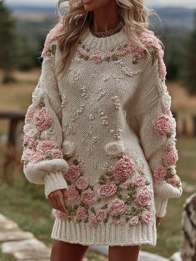 Women’s Rose Art Cozy Knit Mini Sweater Dress