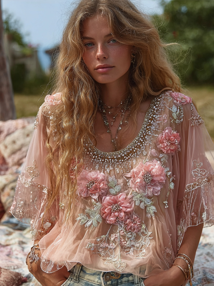 Women’s Vintage Pink Flower Embroidery Art Round Neck Long Sleeve Linen Blend T-shirt