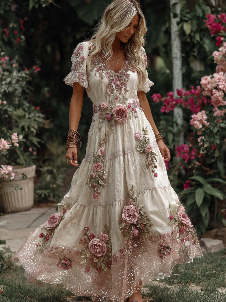 Women’s Rose Embroidery Art V-neck Short Sleeve Maxi Dress