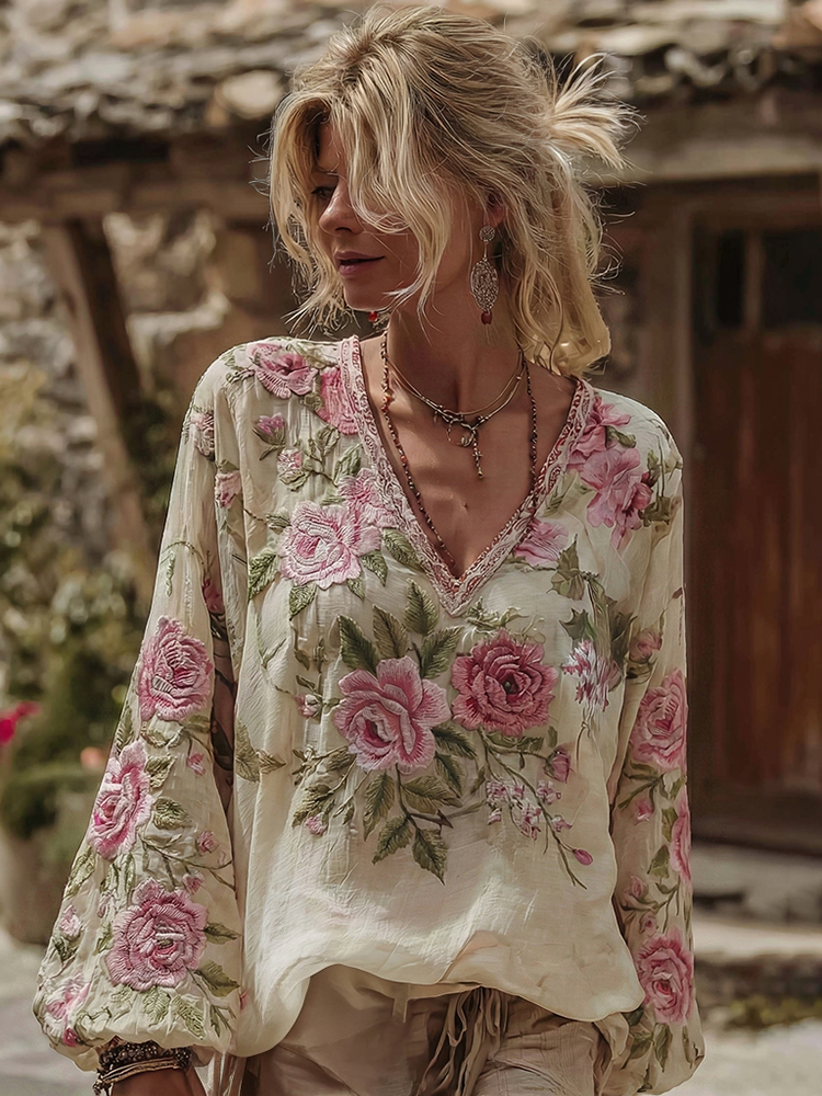 Women’s Vintage Pink Flower Embroidery Art Round Neck Long Sleeve Linen Blend T-shirt