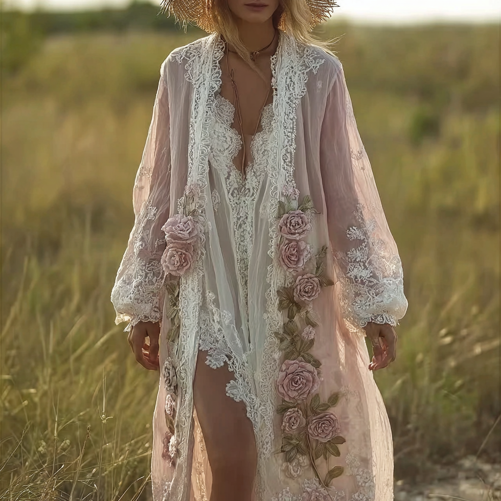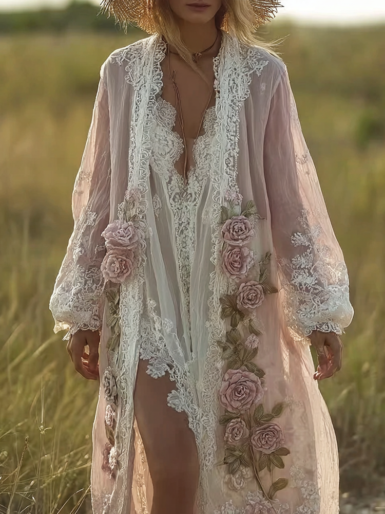 Women’s Spring And Summer Linen Lace Patchwork Casual Long Cardigan
