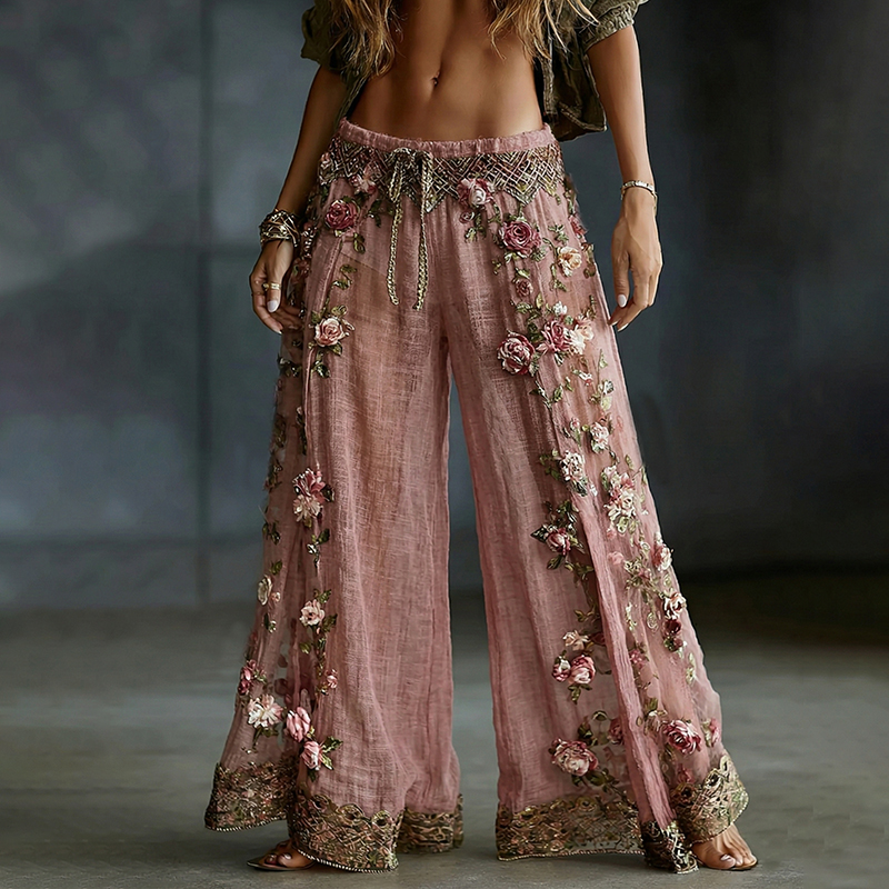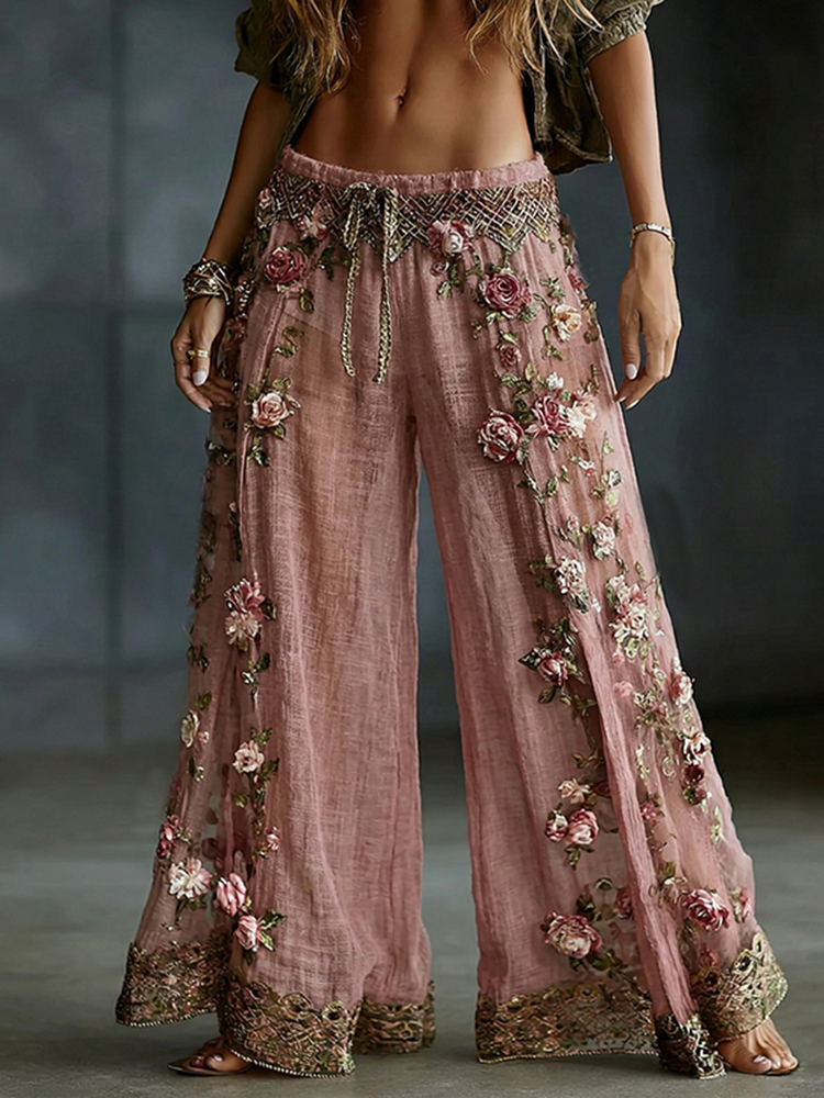Women’s Spring Floral Embroidered Art Print Flowy Linen Blend Casual Pants