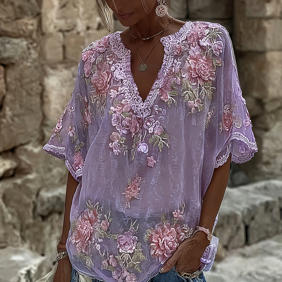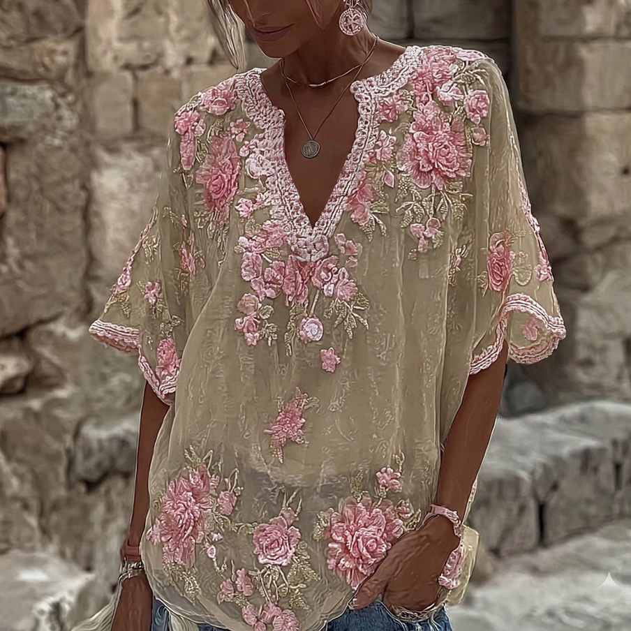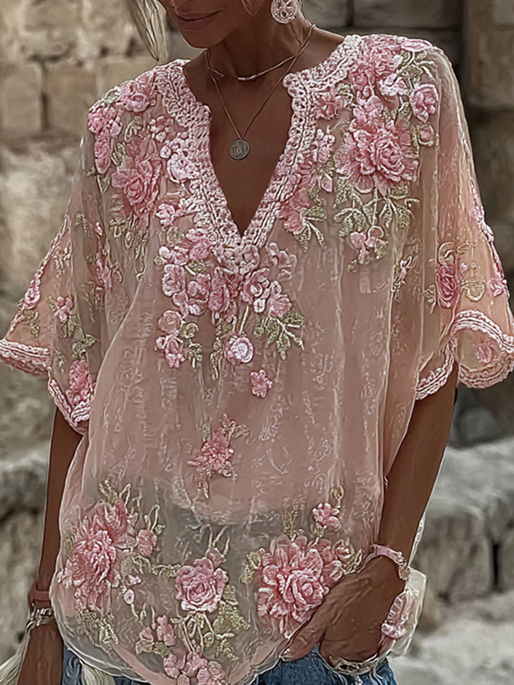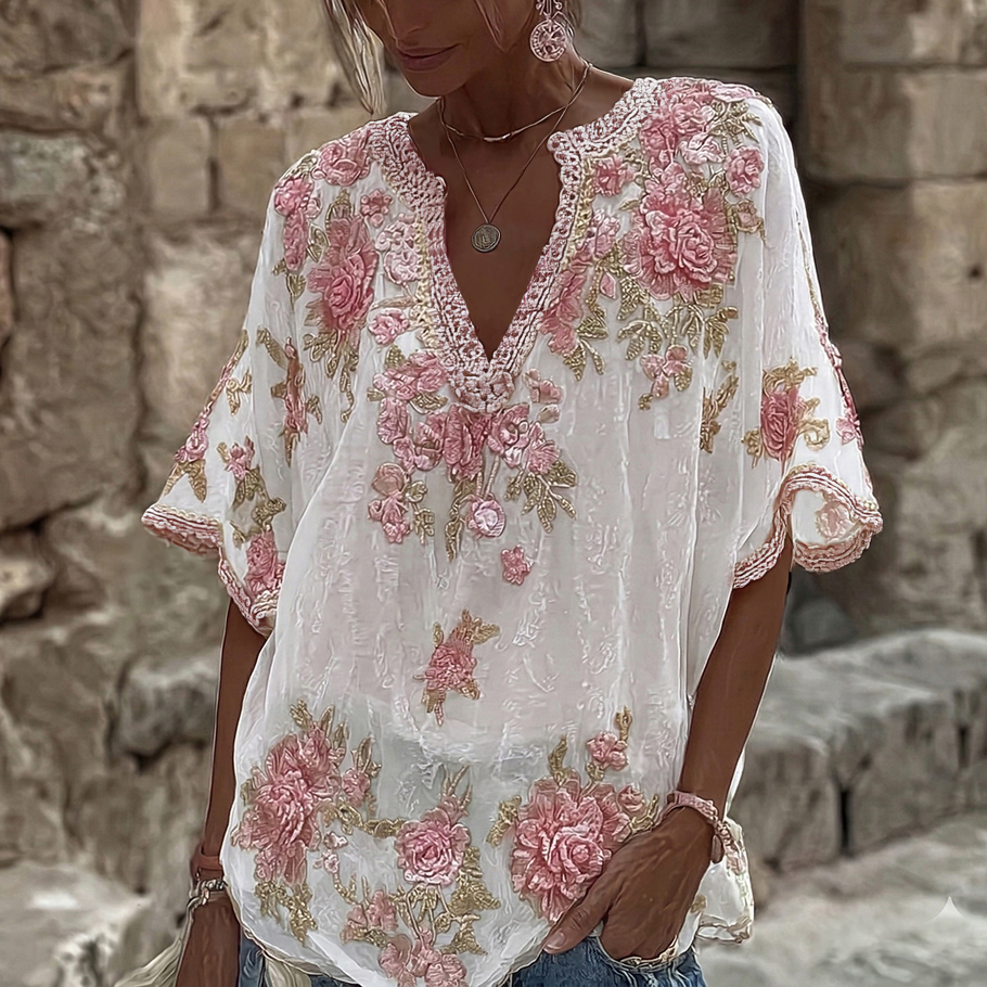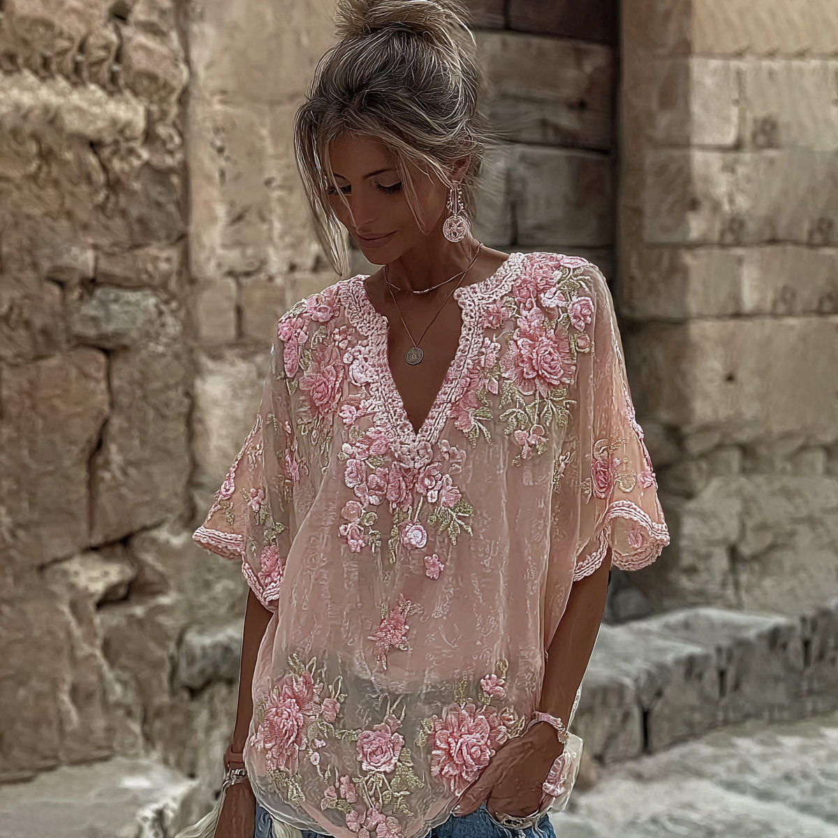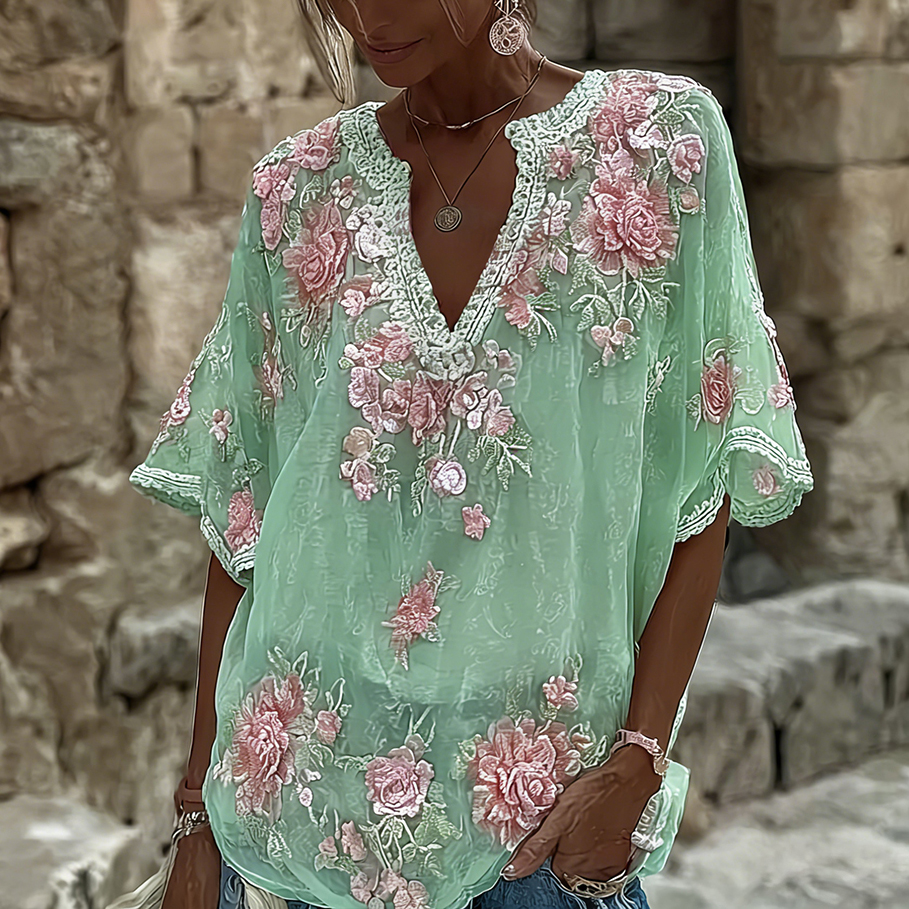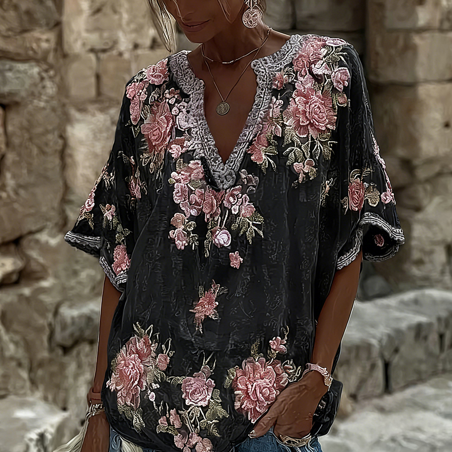 Women’s Vintage Resort Embroidered Floral V-neck T-shirt