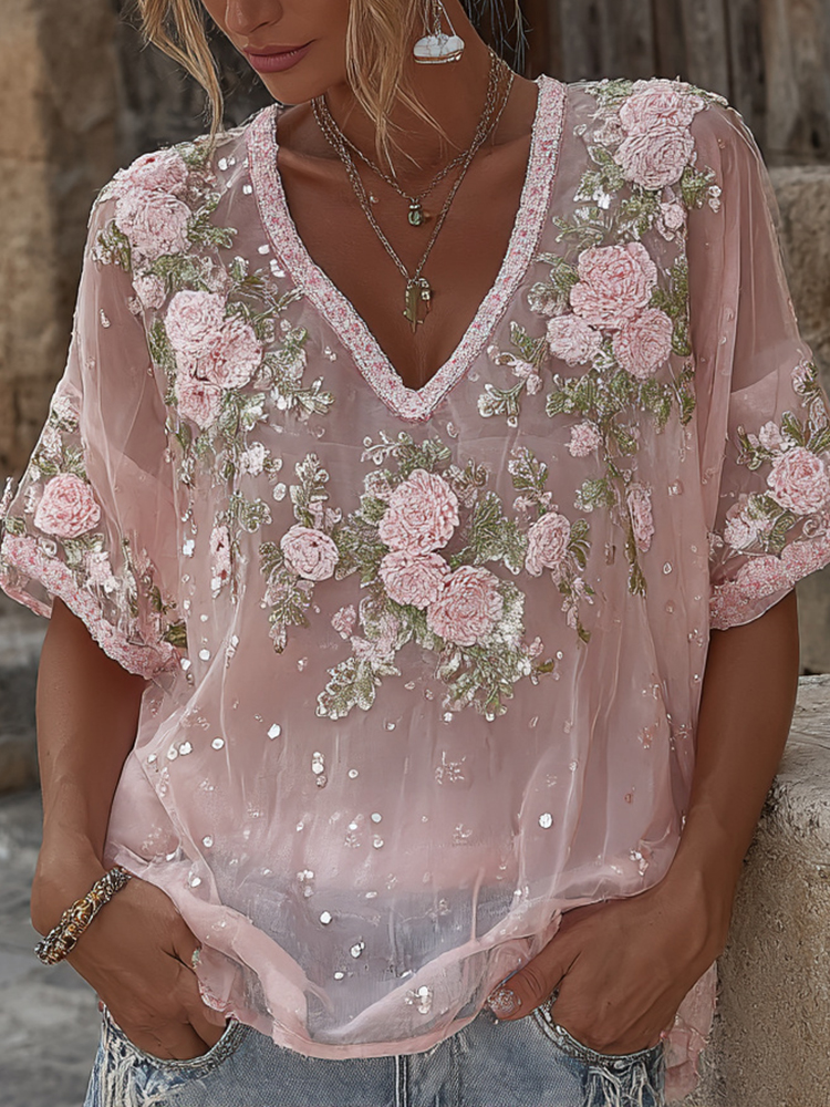 Bohemian-style Pink Floral Embroidery V-neck Short-sleeved Shirt With Sequins