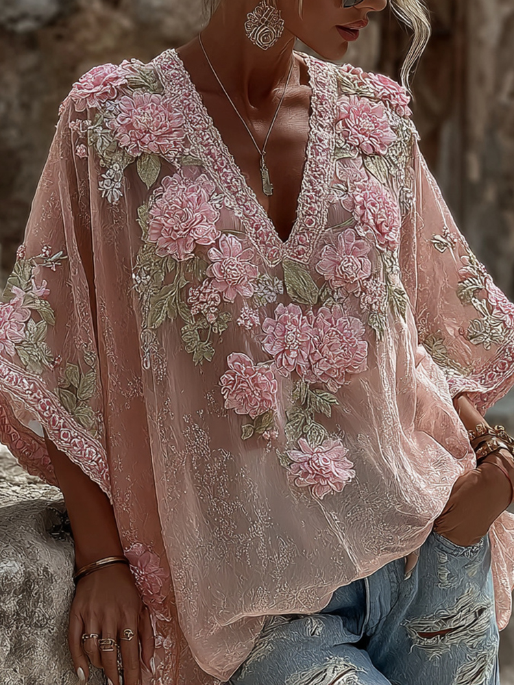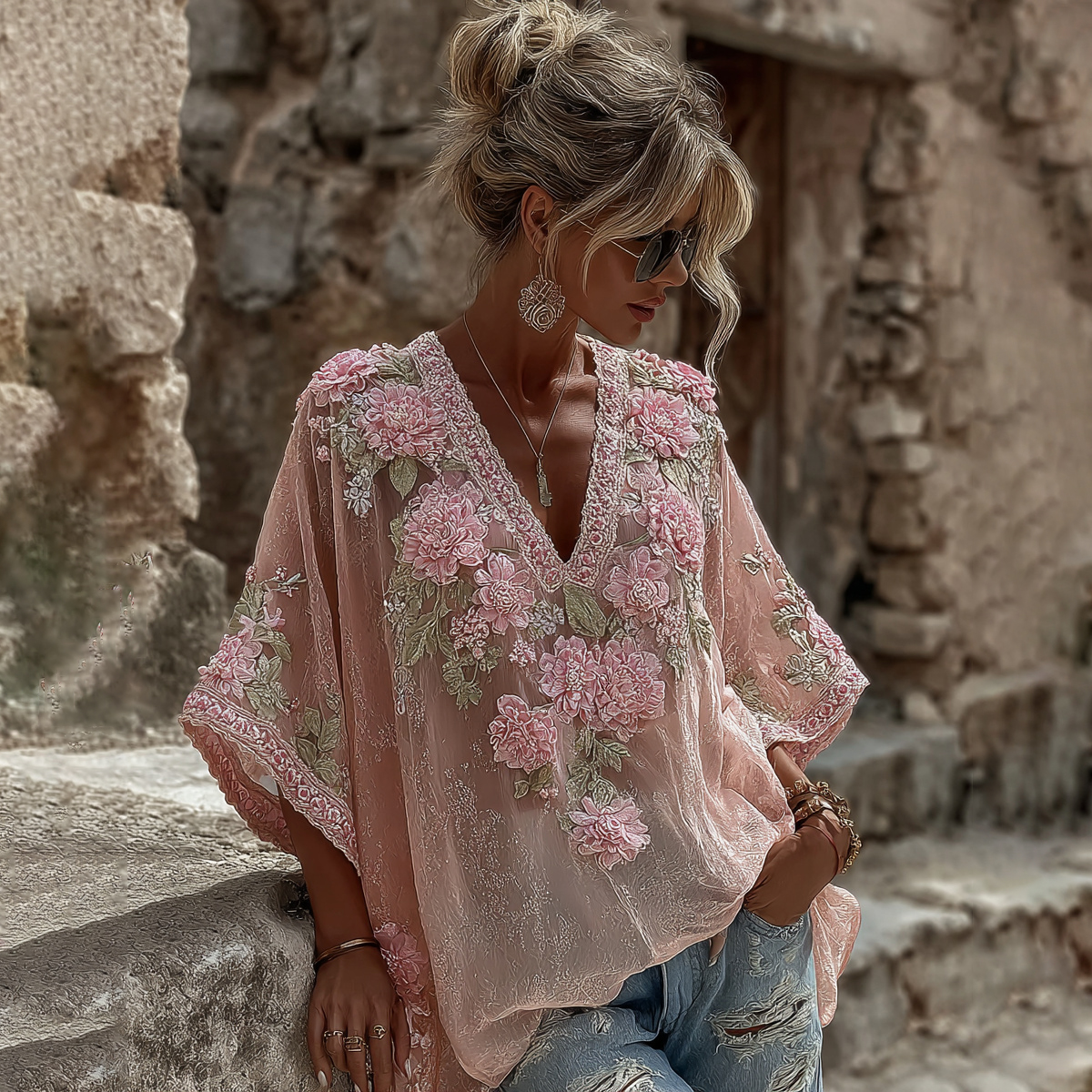 Bohemian-style Pink Floral Embroidery V-neck Short-sleeved Shirt With Sequins