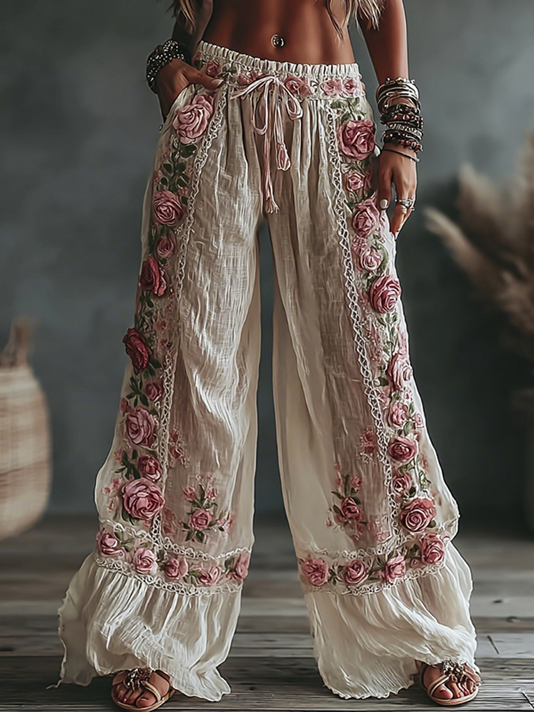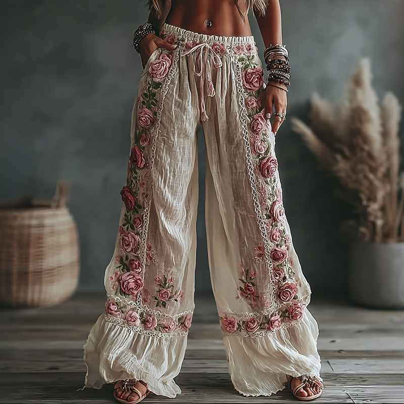 Women’s Spring Roses Embroidered Art Print Flowy Linen Blend Casual Pants