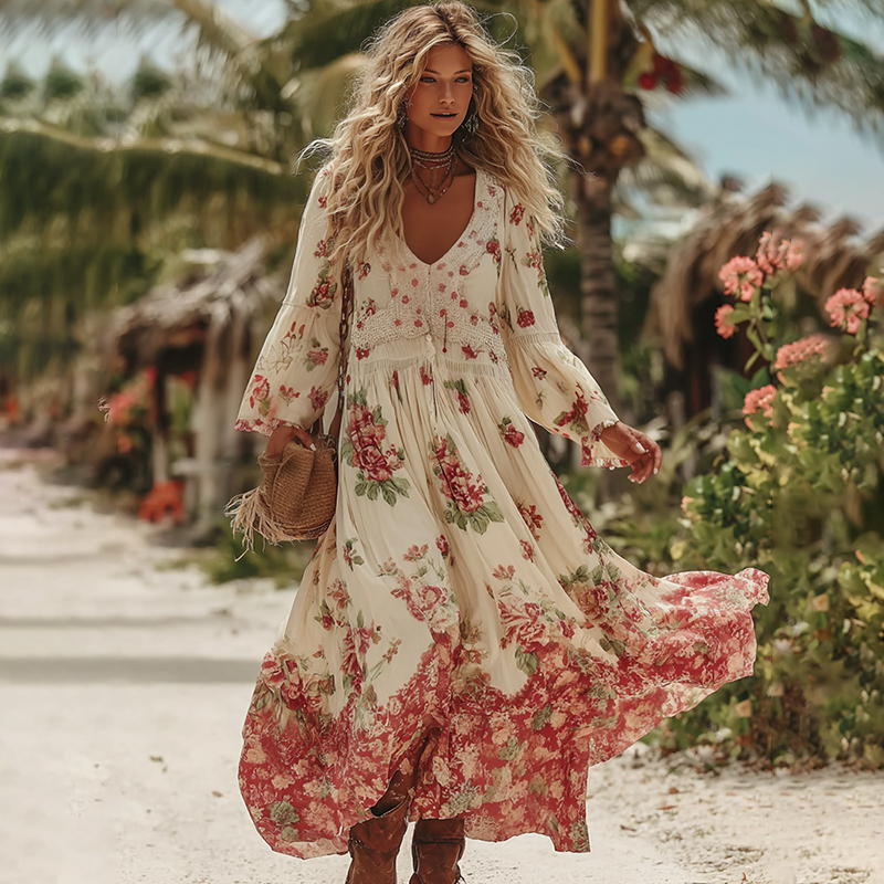 Vintage Boho Roses Embroidered Flowy Linen Maxi Dress