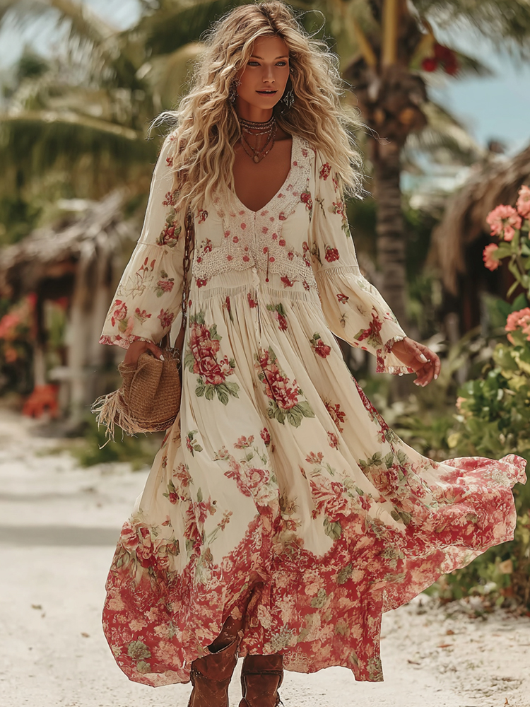 Women’s Vacation Romantic Rose Patchwork Art Comfy Linen Maxi Dress