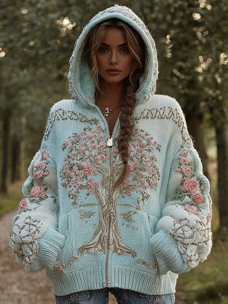Women’s Viking Pink Rose Tree Of Life Knit Zip-up Hooded Sweater