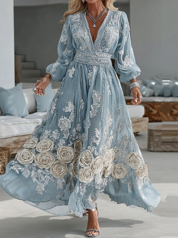 Women’s Vintage Blue Rose Embroidery Long Sleeve Casual Maxi Dress