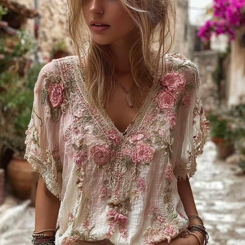 Bohemian-style Pink Floral Embroidery V-neck Short-sleeved Shirt With Sequins