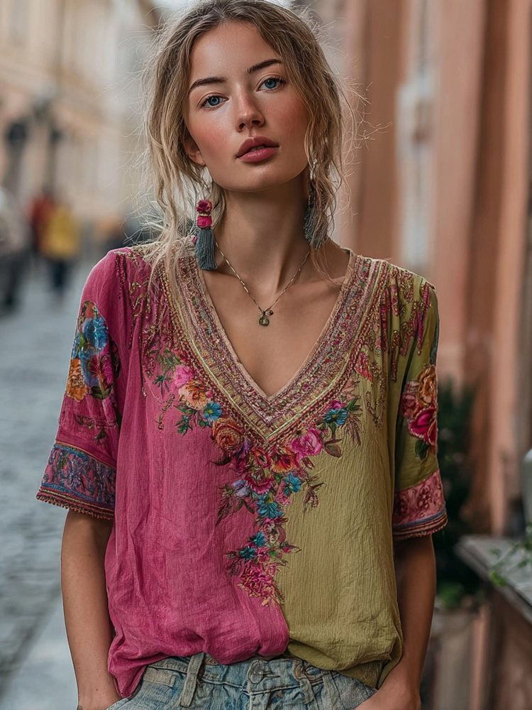 Women’s Vintage Bohemian Floral Embroidery Art V-neck Linen Blend T-shirt