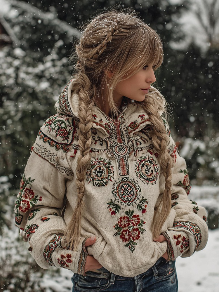 Women’s Vintage Ethnic Floral And Viking Rune Embroidered Hooded Sweater