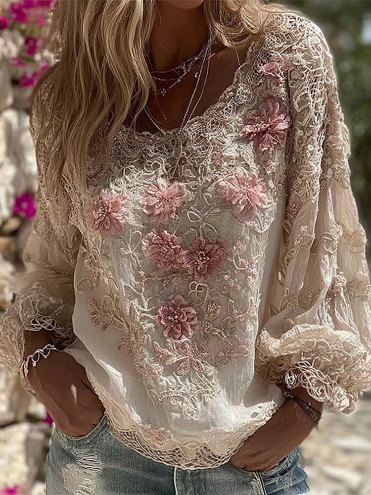 Women’s Vintage Pink Rose Embroidery Art Round Neck Long Sleeve Linen Blend T-shirt