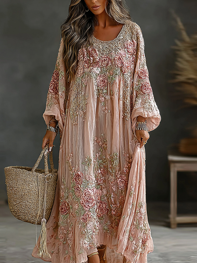 Women’s Vintage Pink Floral Embroidery Art Comfy Linen Maxi Dress