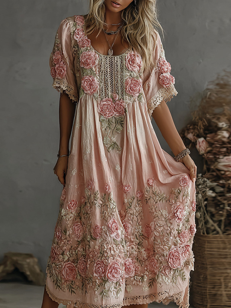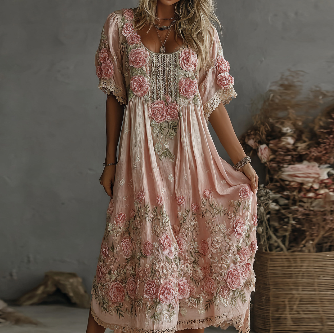 Women’s Vintage Rose Embroidery Art Comfy Linen Maxi Dress