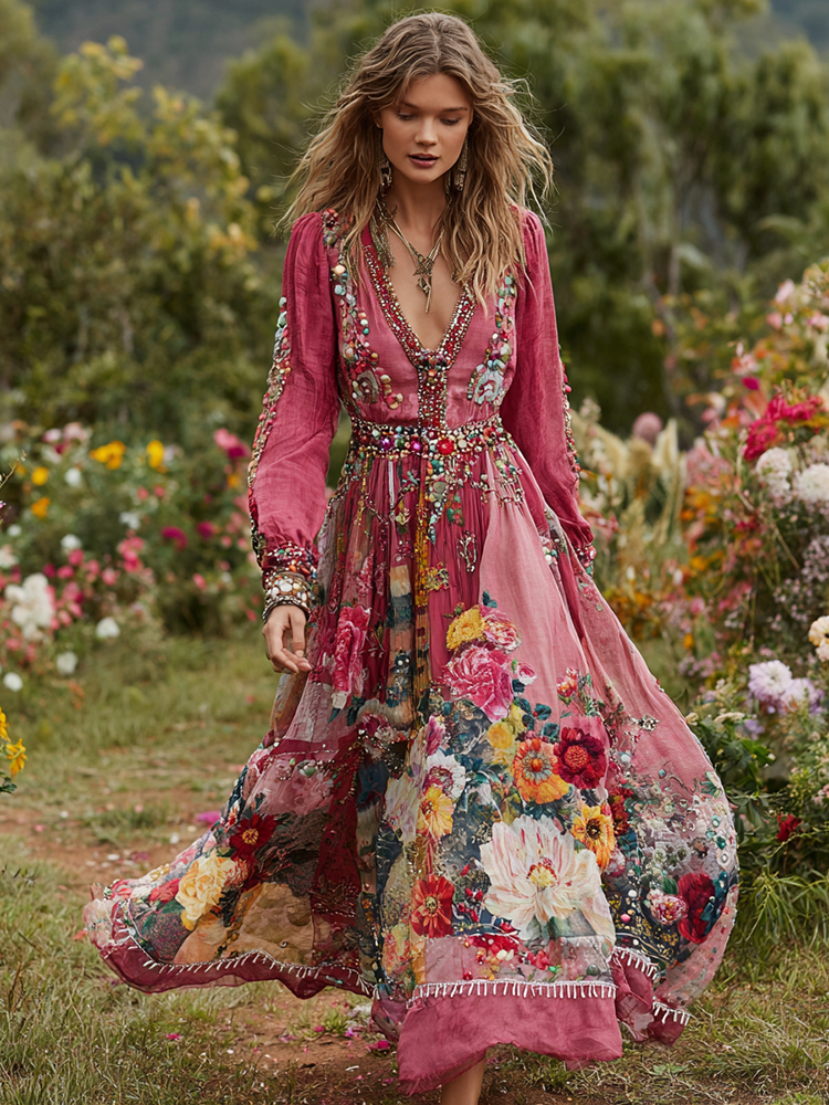 Women’s Vintage Floral Art Print V-neck Long Sleeve Maxi Dress
