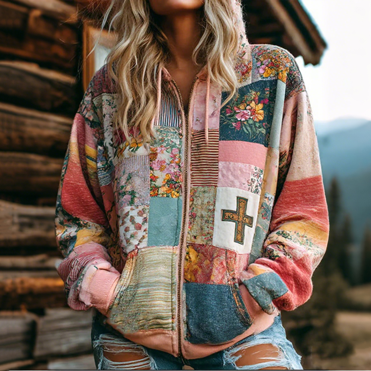 Women’s Vintage Floral Cross Patchwork Cozy Warm Zipper Hoodie
