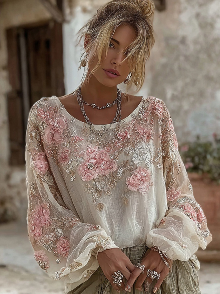 Women’s Vintage Pink Floral Embroidered Art V-neck Long Sleeve Blouse