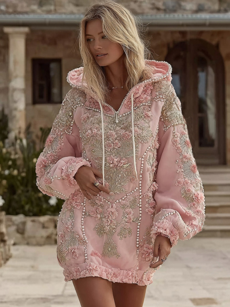Women’s Vintage Floral Embroidery Art Long Sleeve Hooded Mini Dress
